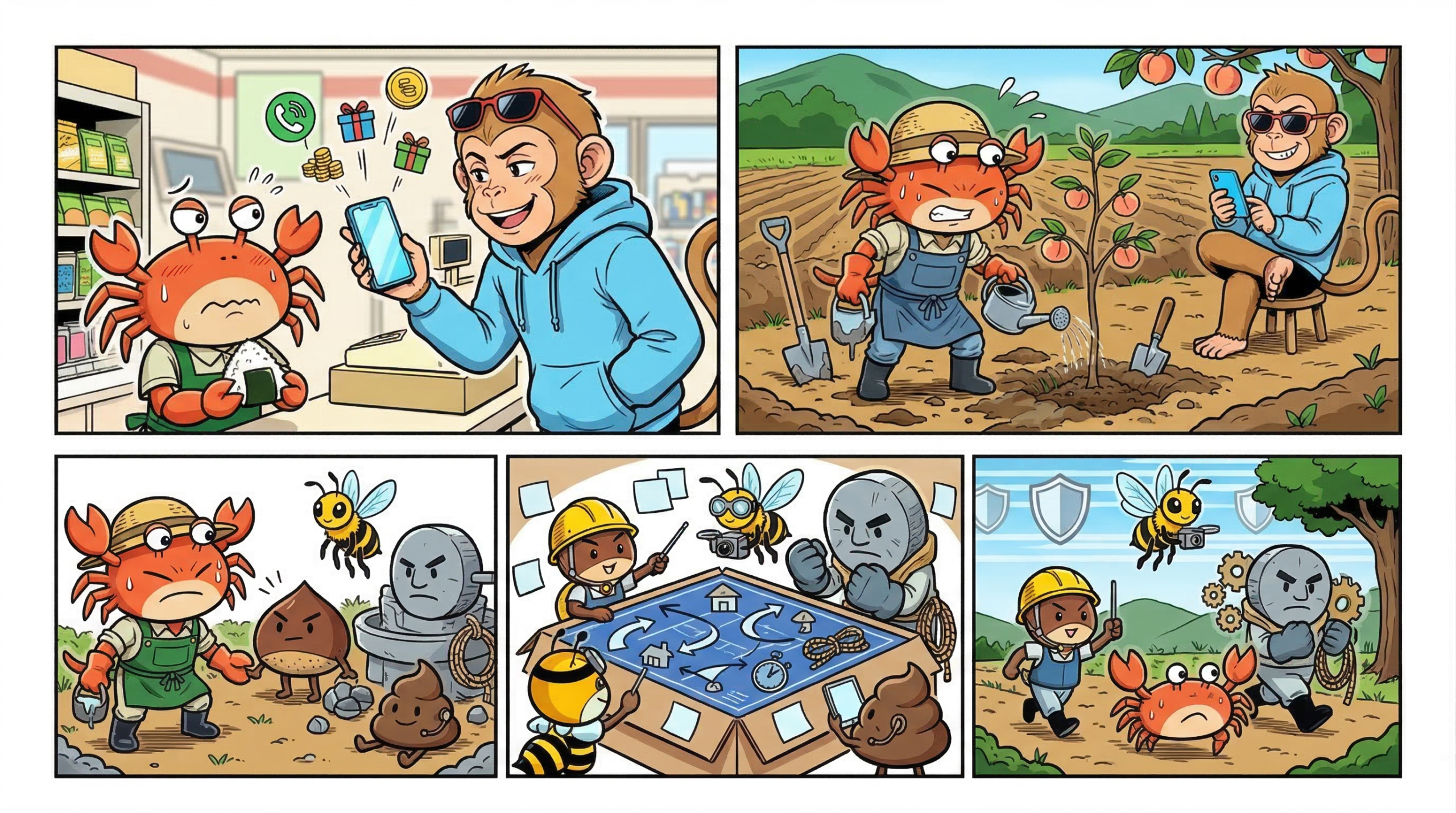 コンビニのレジ横で、おにぎりを握りしめたまま立ち尽くす「かに」を想像する。そこへ、口のうまい「さる」が寄ってきて、「それ、今食べたら終わり。でも“種”に替えれば、あとで実りが増える」と囁く。投資話・副業勧誘・ポイント経済圏のテンプレみたいな甘い未来図。かには渋々交換し、柿の木を育て、いざ収穫の局面で“プラットフォーム強者”のさるに総取りされる。ここまで、弱者が手間を引き受け、強者が果実を回収する構図があまりに現代的だ。